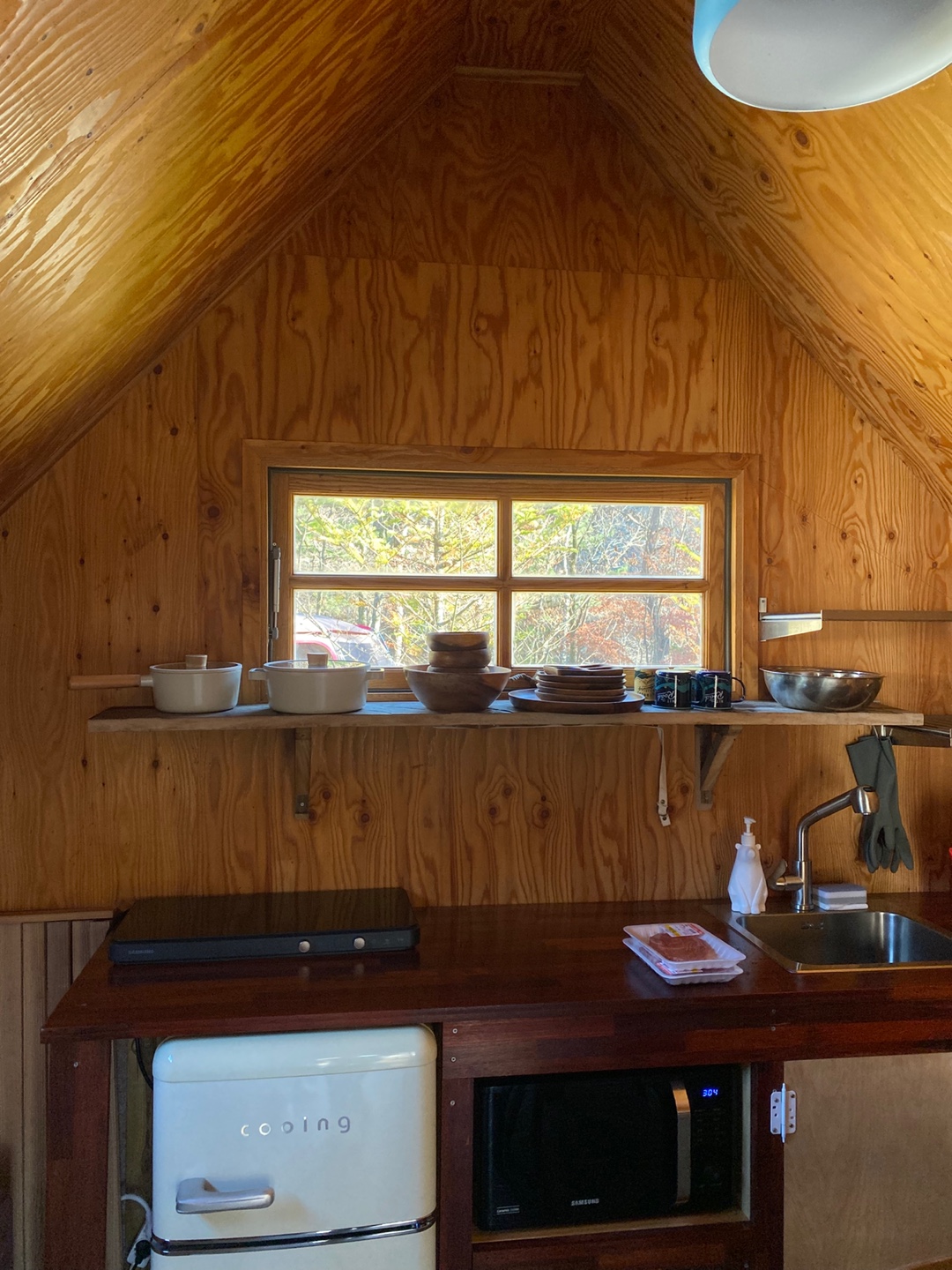 야외 키친은 다른 글램핑장처럼 그냥 텐트에 붙어 있는 게 아니라, 오두막 형태로 독립적인 공간이어서 프라이빗한 느낌을 줍니다. 제가 이용했던 날에는 비바람이 실제로 불었는데, 오두막에 와서 아늑하게 식사를 즐길 수 있어서 너무 좋았습니다. 키친 내부에는 인덕션, 전자레인지, 버너 등 거의 모든 조리 기구와 도구들이 갖추어져 있었어요. 다만, 전기 포트가 없어서 아침에 커피 마실 때 냄비로 물을 끓여야 했다는 것과, 식기들이 나무여서 위생 관리가 잘 안 된다는 점이 아쉬웠습니다.